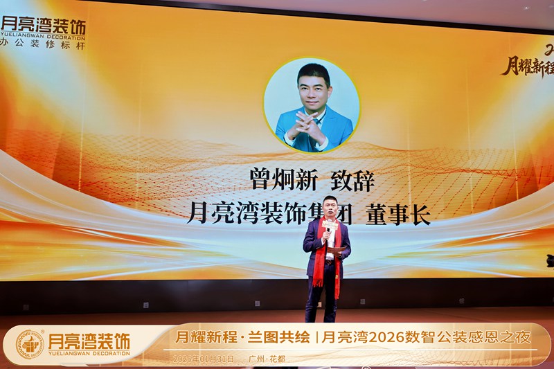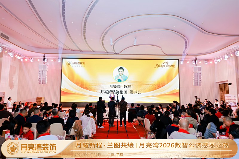 2026年1月31日,月亮湾装饰“月耀新程 兰图共绘”年度总结表彰大会在广州隆重举行。公司创始人、董事长曾炯新先生,副董事长李以宽女士,董事总经理吴楚文先生等核心管理层,与全体员工及合作伙伴齐聚一堂,共同回顾2025年的奋斗征程,表彰先进,展望数智化新未来。